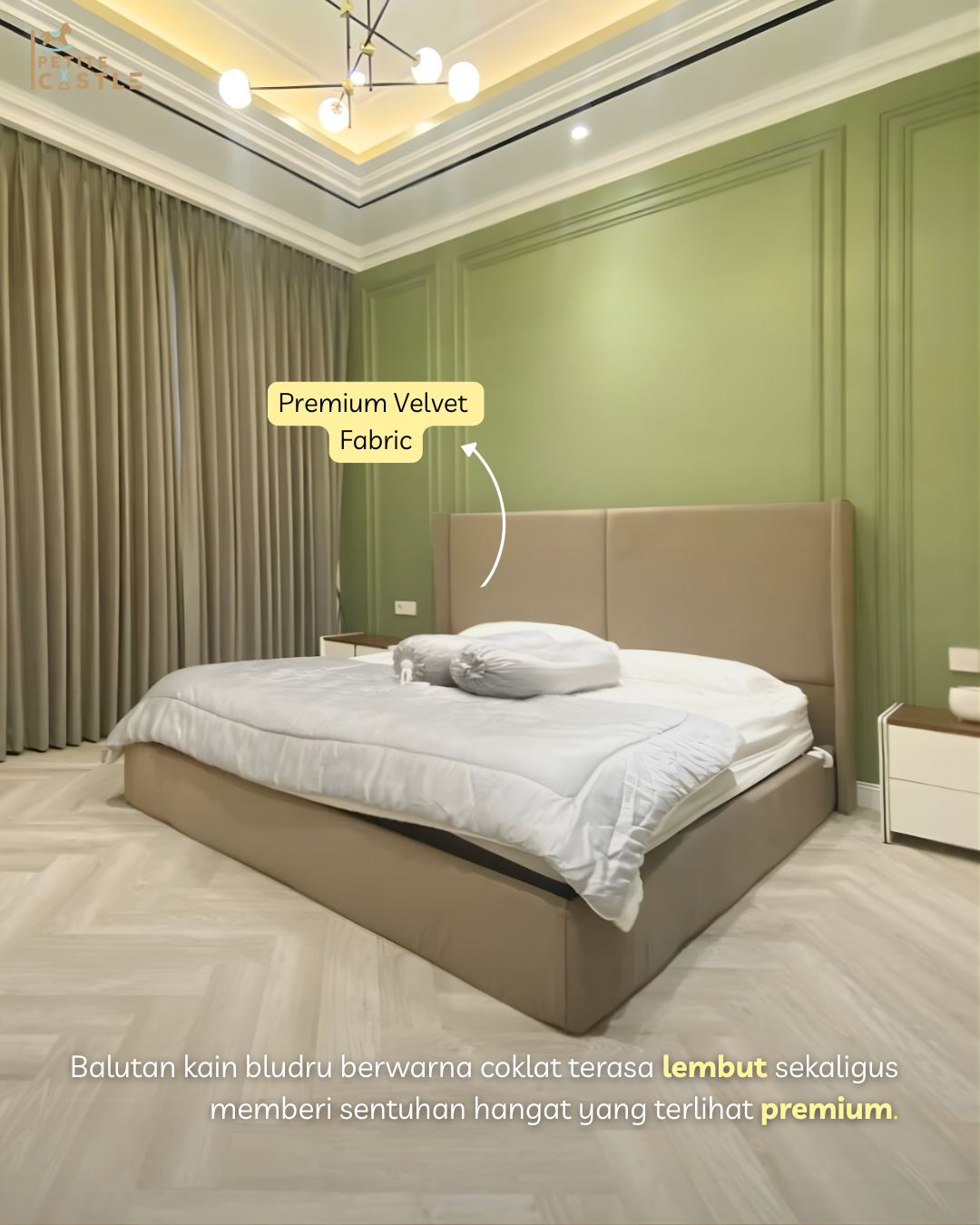 Fokus utama kamar ini ada pada bedframe yang tampil elegan namun tetap memberikan kesan hangat. Dibalut dengan kain bludru (velvet) premium, tempat tidur ini menghadirkan tekstur yang lembut dan nyaman saat disentuh, sekaligus memberikan tampilan yang lebih eksklusif tanpa terlihat berlebihan. Nuansa cozy yang dihasilkan membuat anak merasa lebih betah berada di kamar, baik untuk beristirahat maupun sekadar bersantai. Desainnya dibuat simpel dan clean, sehingga tetap relevan meskipun selera anak berubah seiring waktu. Inilah yang membuatnya ideal untuk kamar anak tidak hanya indah untuk saat ini, tetapi juga mampu bertahan secara estetika dalam jangka panjang.
