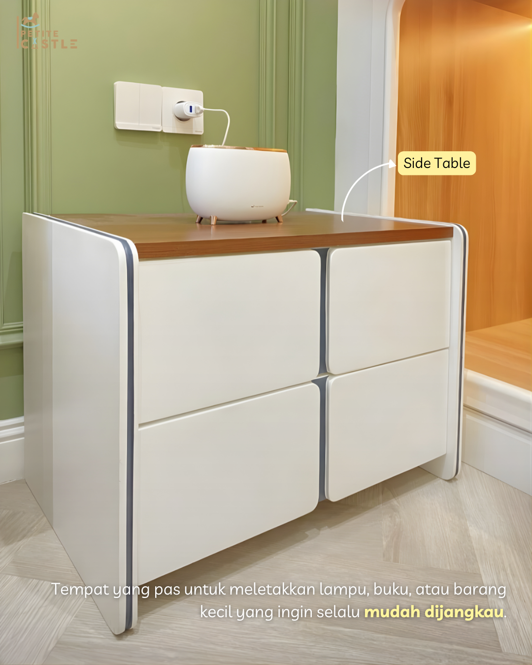Di sisi kiri dan kanan tempat tidur, terdapat side table yang melengkapi fungsi ruang secara praktis sekaligus estetis. Meskipun terlihat simpel, elemen ini memiliki peran penting dalam menunjang kenyamanan sehari-hari, seperti untuk menyimpan barang-barang kecil seperti buku, lampu tidur, atau mainan favorit anak agar mudah dijangkau. Kehadirannya juga membantu menciptakan keseimbangan visual pada area tempat tidur, sehingga tampilan kamar terasa lebih rapi dan terorganisir. Dengan desain yang senada dengan keseluruhan kamar, side table ini tidak terlihat seperti tambahan, melainkan menyatu sebagai bagian dari konsep desain yang utuh.