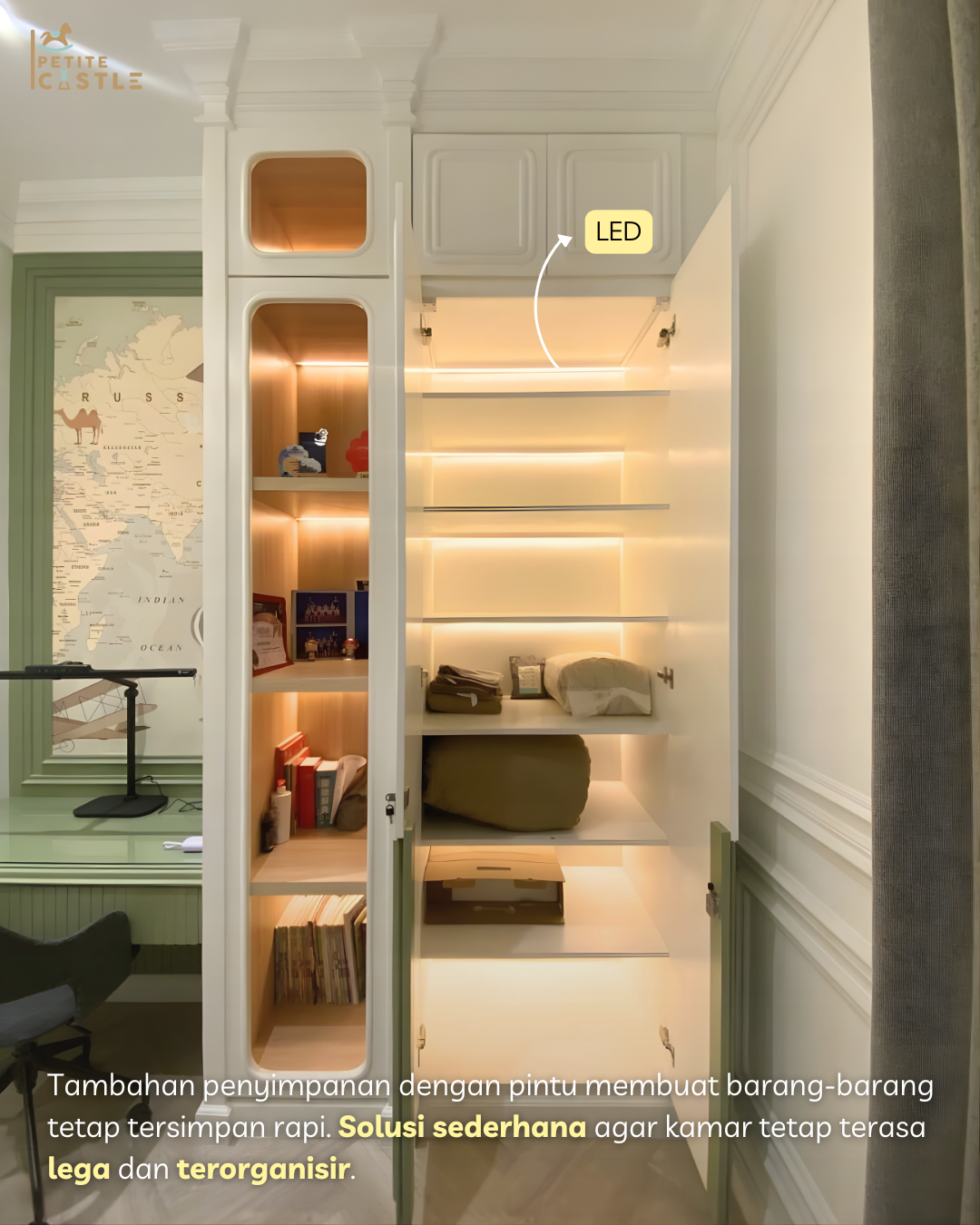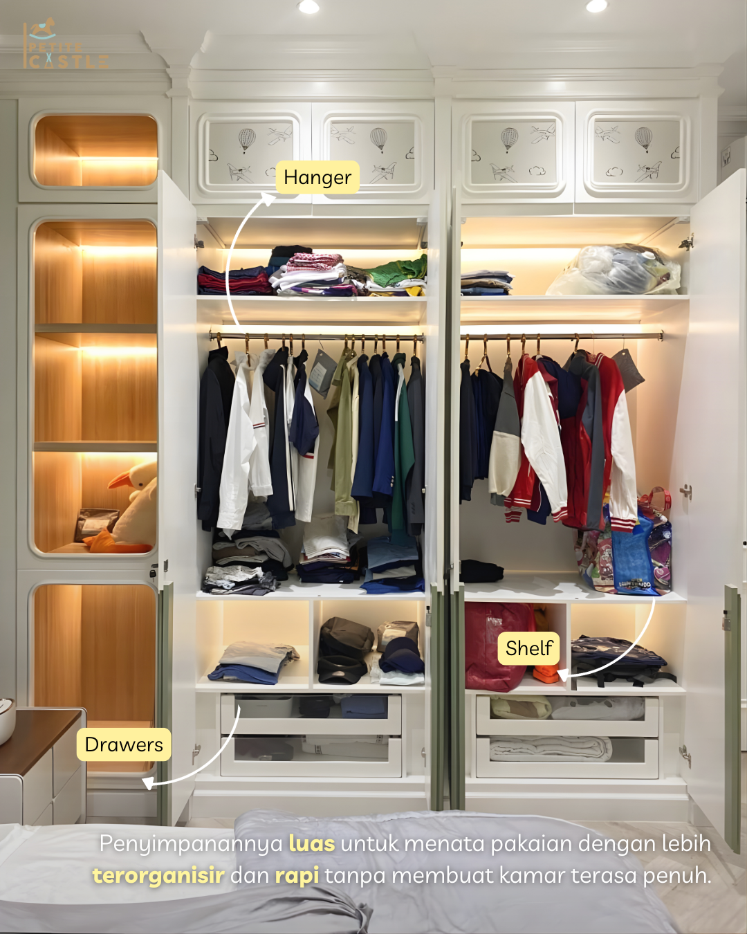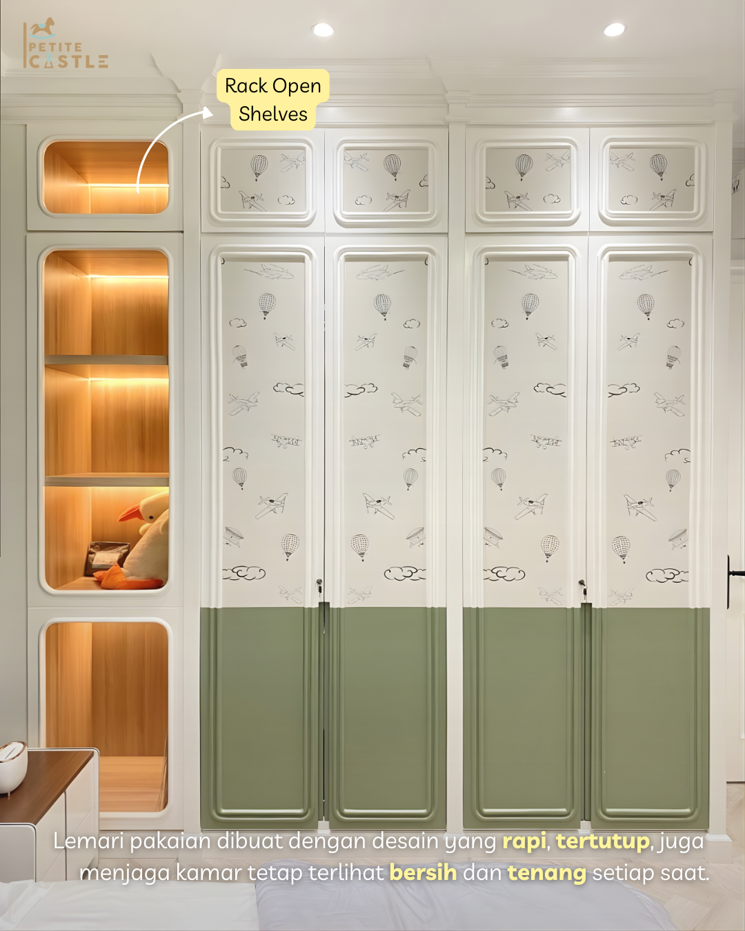 Salah satu keunggulan utama kamar ini adalah lemari pakaian berukuran besar yang dirancang dengan kapasitas penyimpanan sangat luas. Lemari ini mampu menampung kebutuhan pakaian anak dari masa kecil hingga remaja, sehingga menjadi solusi jangka panjang tanpa perlu sering mengganti furnitur. Bagian dalamnya dirancang dengan pembagian yang efisien, mulai dari area gantung, lipat, hingga ruang penyimpanan tambahan, sehingga semua barang dapat tersusun rapi. Meskipun ukurannya besar, desainnya yang clean dan warna netral membuat lemari ini tetap terlihat ringan secara visual dan tidak membuat ruangan terasa penuh.