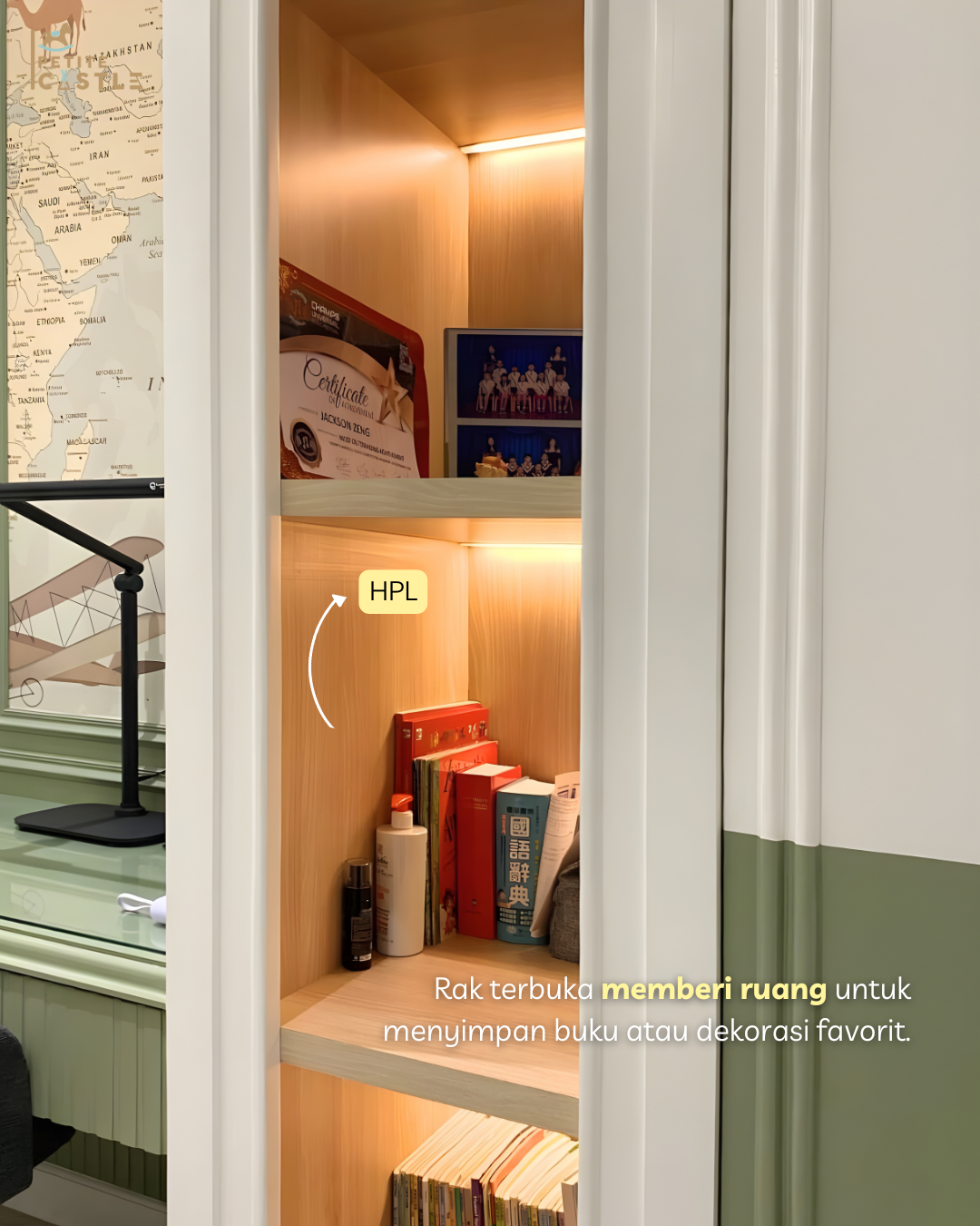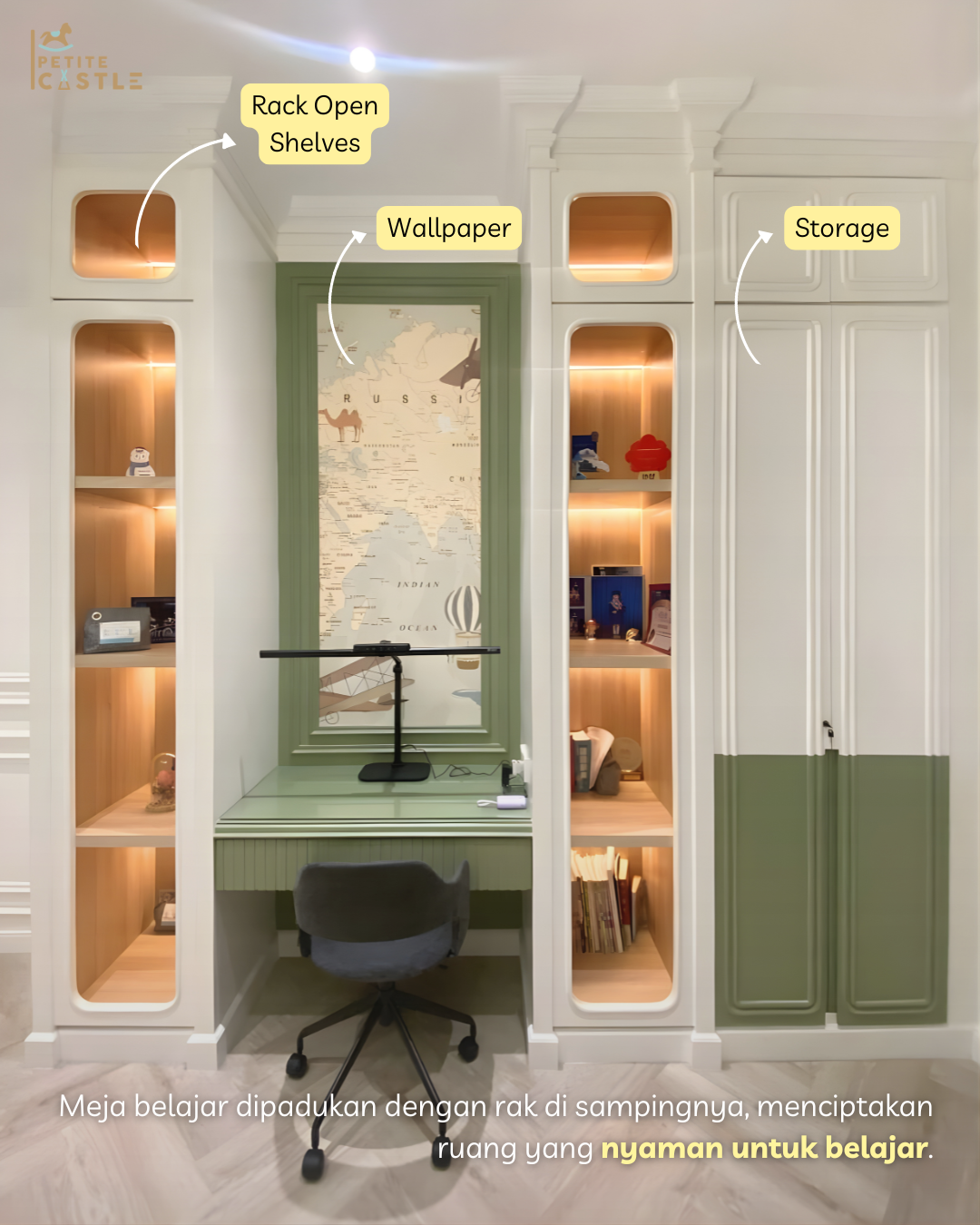 Area belajar dalam kamar ini dirancang tidak hanya untuk kebutuhan saat ini, tetapi juga sebagai investasi jangka panjang. Meja belajar memiliki ukuran yang cukup luas untuk berbagai aktivitas, mulai dari belajar, menggambar, hingga menggunakan laptop. Desainnya dibuat ergonomis agar tetap nyaman digunakan hingga anak tumbuh dewasa, sehingga tidak perlu diganti dalam waktu dekat. Dengan tampilan yang minimalis dan tidak membosankan, meja ini menjadi salah satu elemen penting dalam kamar anak, karena ruang belajar yang nyaman dapat membantu meningkatkan fokus dan produktivitas mereka sehari-hari.