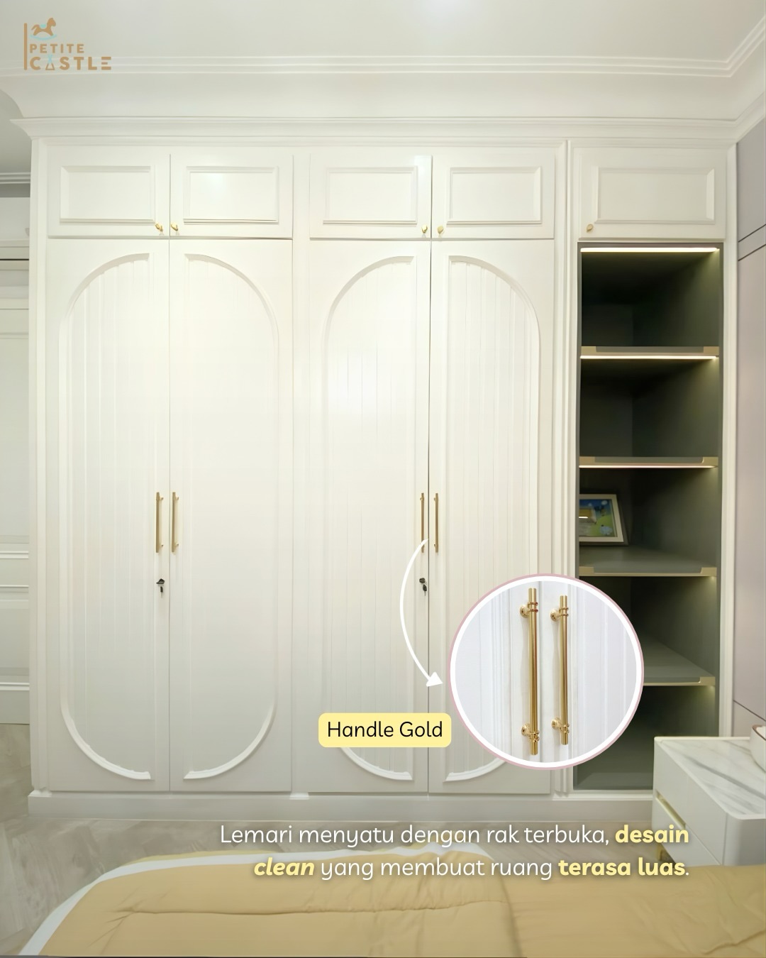Lemari pakaian dirancang dengan konsep minimalis polos tanpa banyak ornamen, sehingga memberikan kesan bersih dan rapi pada ruangan. Untuk menghindari tampilan yang terlalu plain, ditambahkan handle berwarna gold sebagai aksen yang memberikan sentuhan elegan. Finishing yang clean semakin memperkuat kesan modern pada furnitur ini. Perpaduan antara fungsi, estetika, dan sedikit aksen elegan tersebut membuat lemari tidak hanya berperan sebagai tempat penyimpanan, tetapi juga sebagai elemen yang meningkatkan tampilan keseluruhan kamar menjadi lebih “naik kelas”.