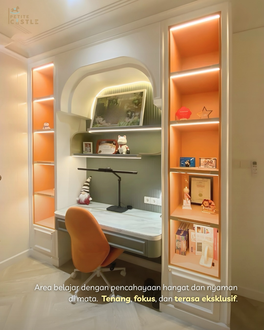 Meja belajar dalam kamar ini dirancang tidak hanya sebagai tempat untuk belajar, tetapi juga sebagai area bagi anak untuk mengekspresikan dirinya. Di sisi kanan dan kiri meja terdapat rak terbuka yang bisa dimanfaatkan untuk menyimpan buku, menaruh pajangan, hingga memajang piala atau penghargaan. Kehadiran area display ini penting karena dapat menumbuhkan rasa bangga pada anak, membuat kamar terasa lebih personal, serta memotivasi mereka untuk terus berkembang dan berprestasi. Meskipun memiliki banyak fungsi, desain meja tetap dibuat clean agar tidak membuat ruangan terasa penuh atau berantakan.